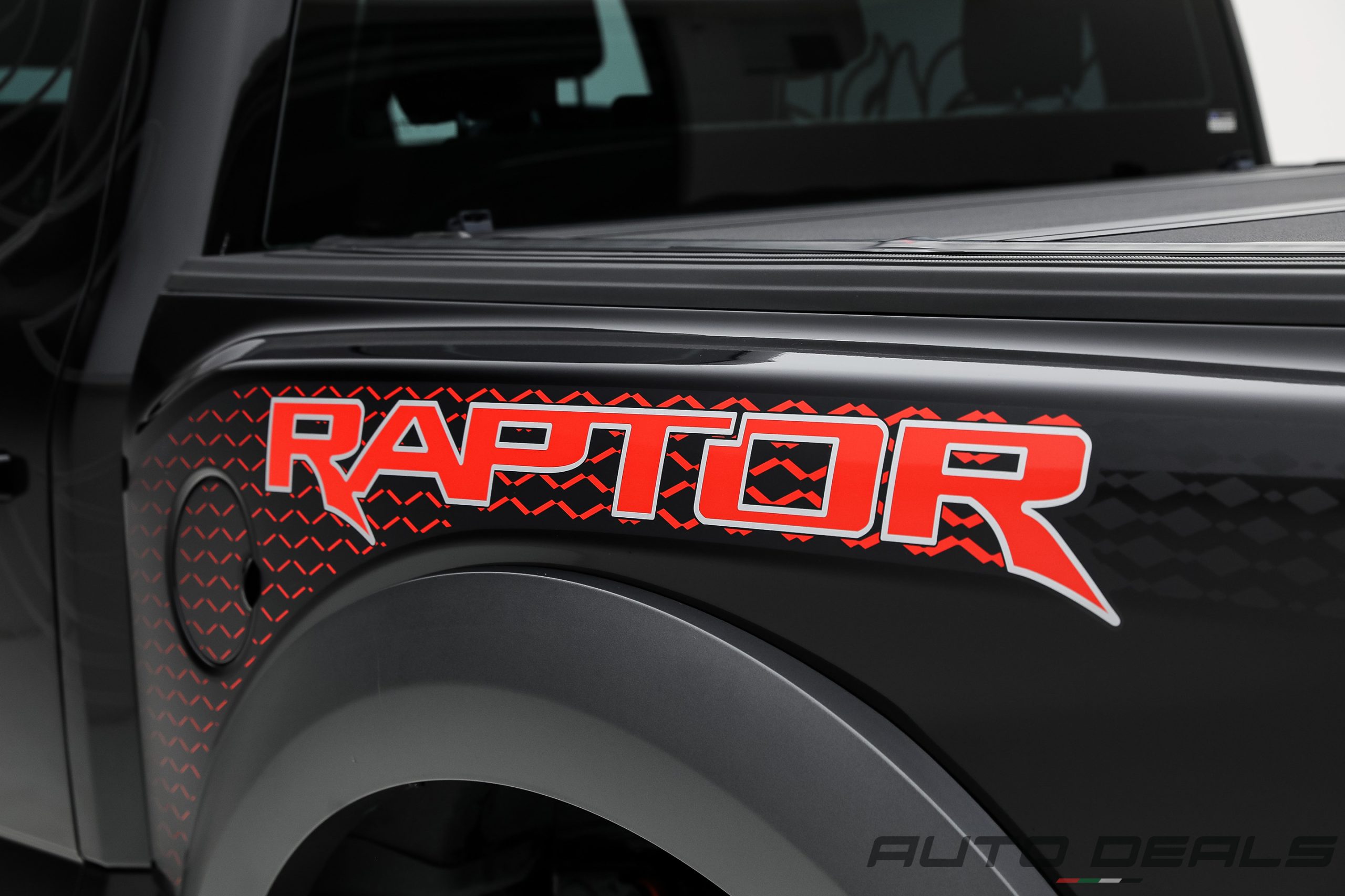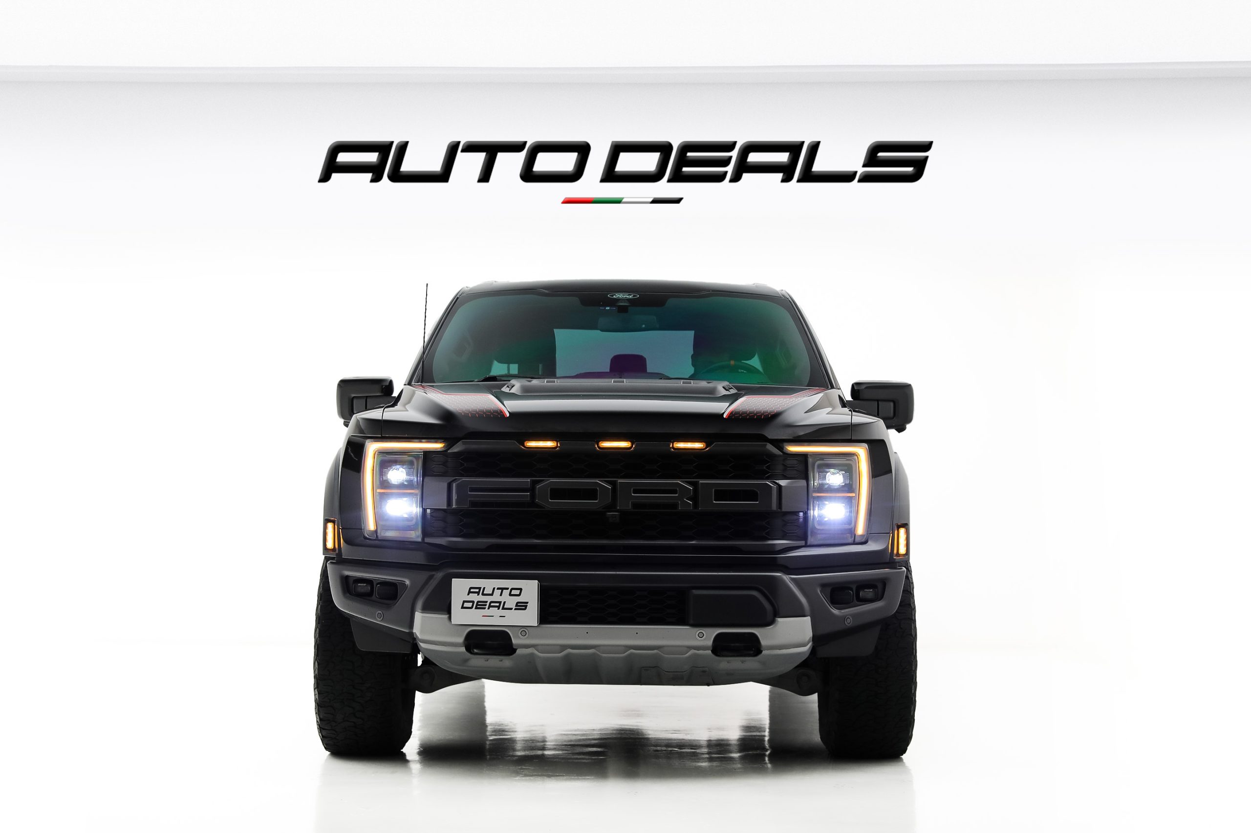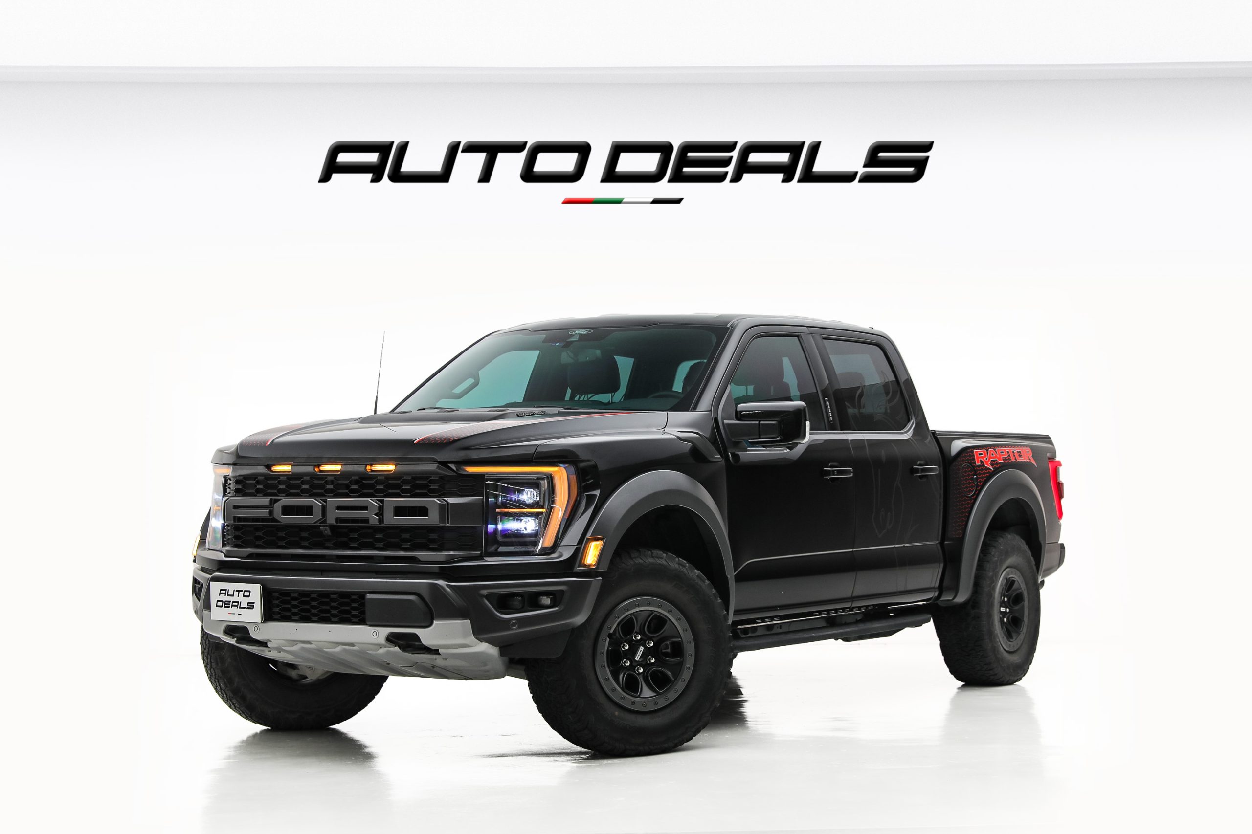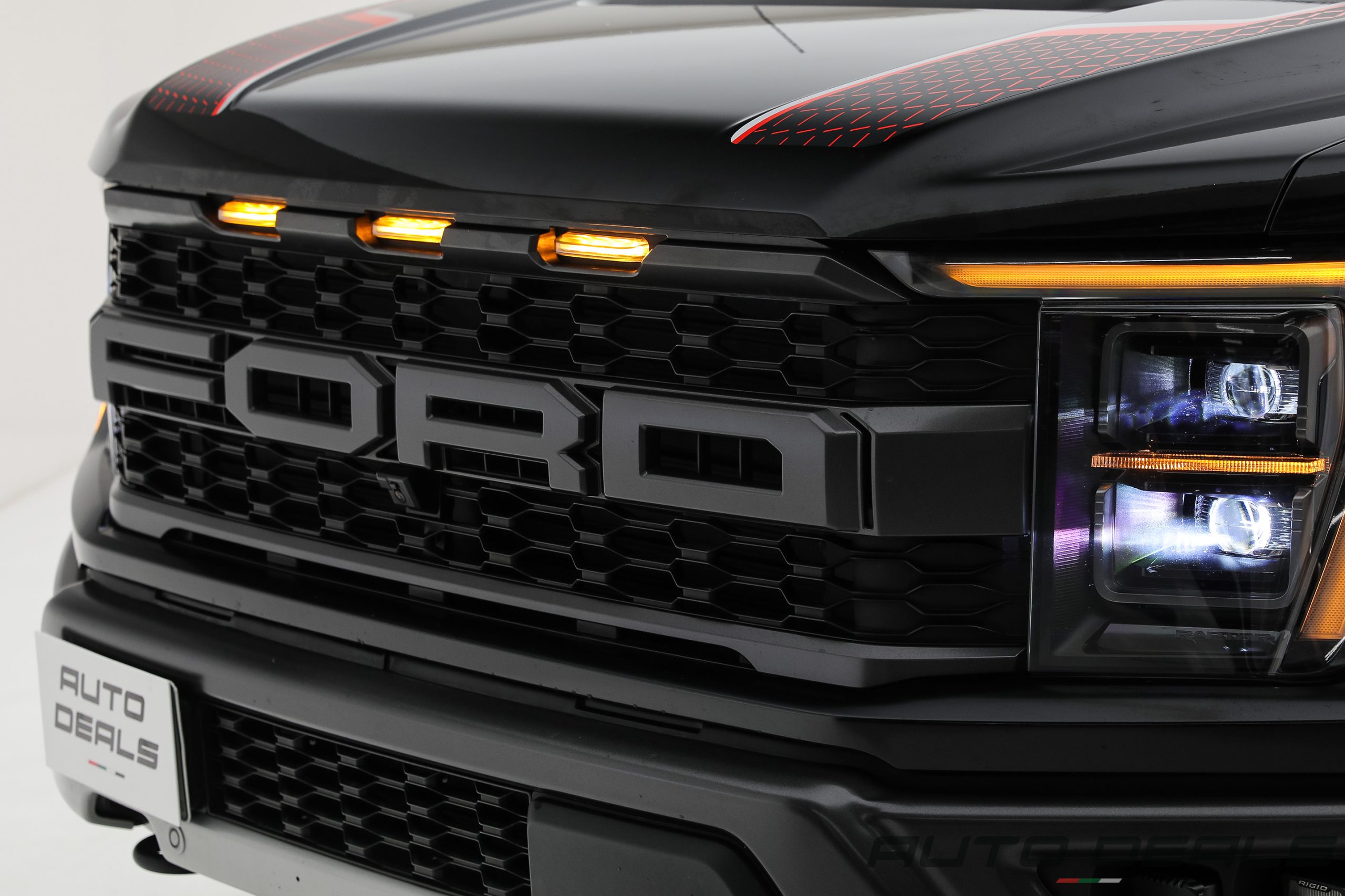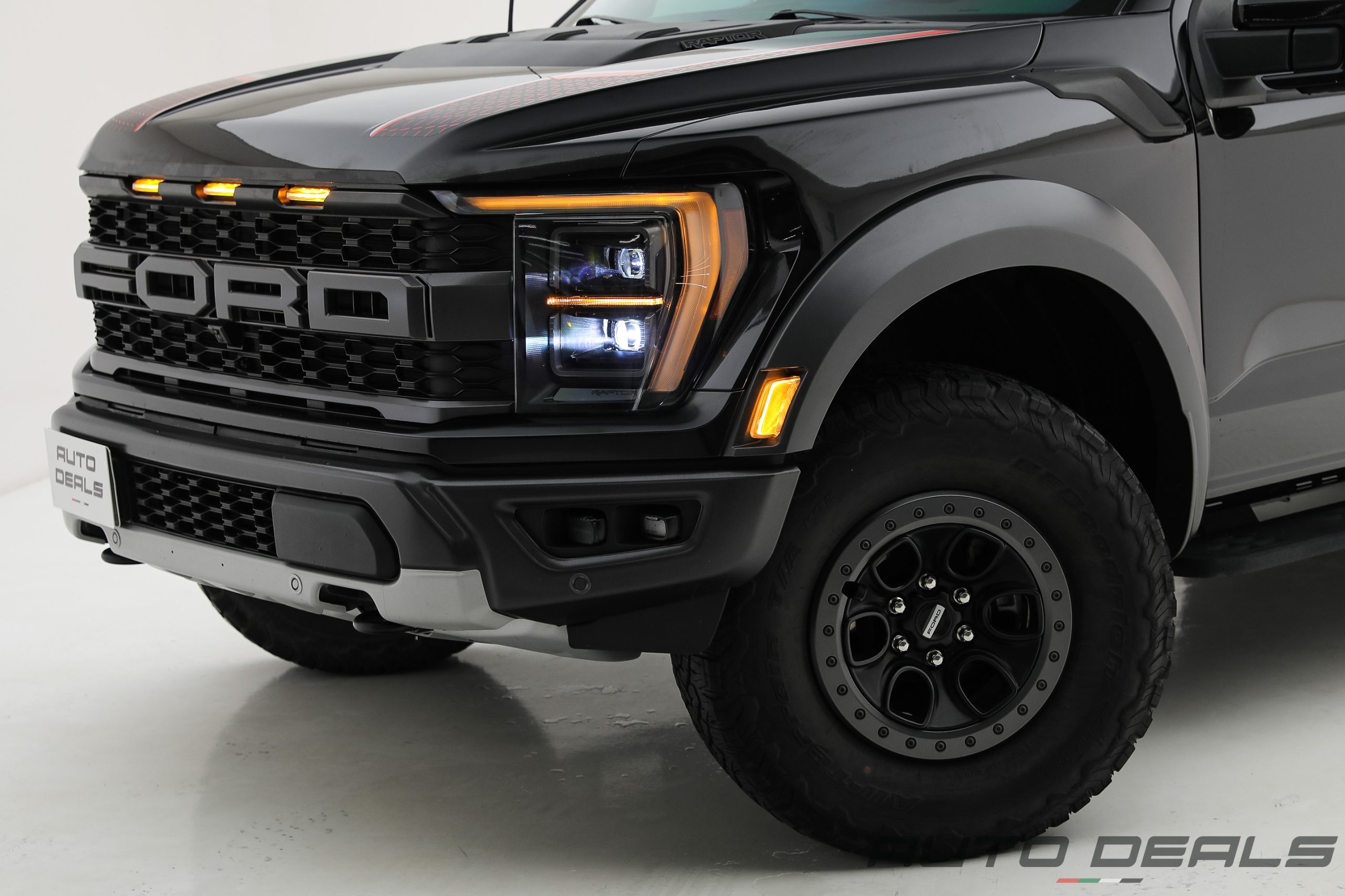 The Ford F-150 Raptor features a bold and aggressive design that clearly reflects its off-road capabilities. A massive front grille with large FORD lettering dominates the front fascia, giving the truck a powerful and unmistakable presence.