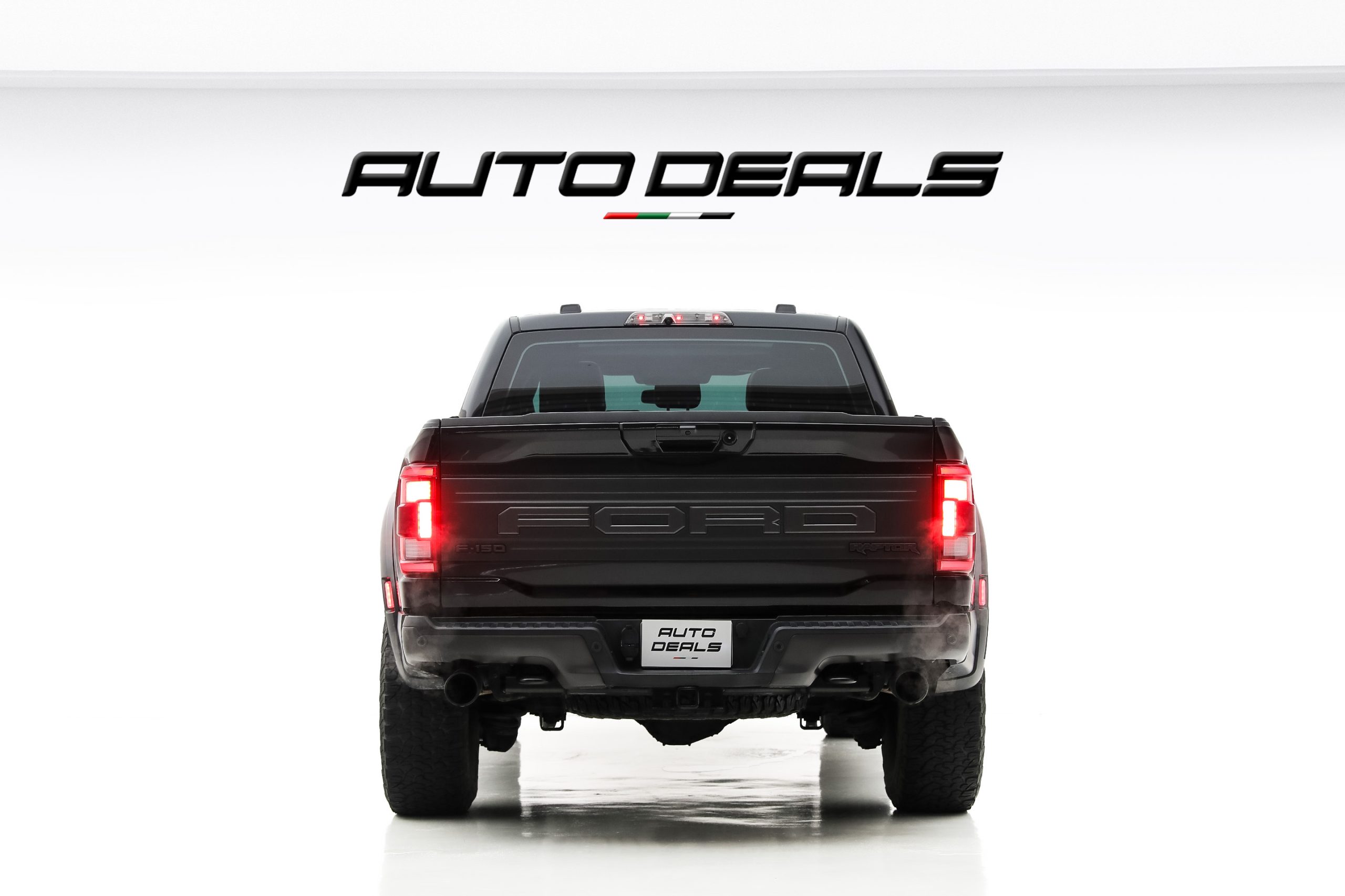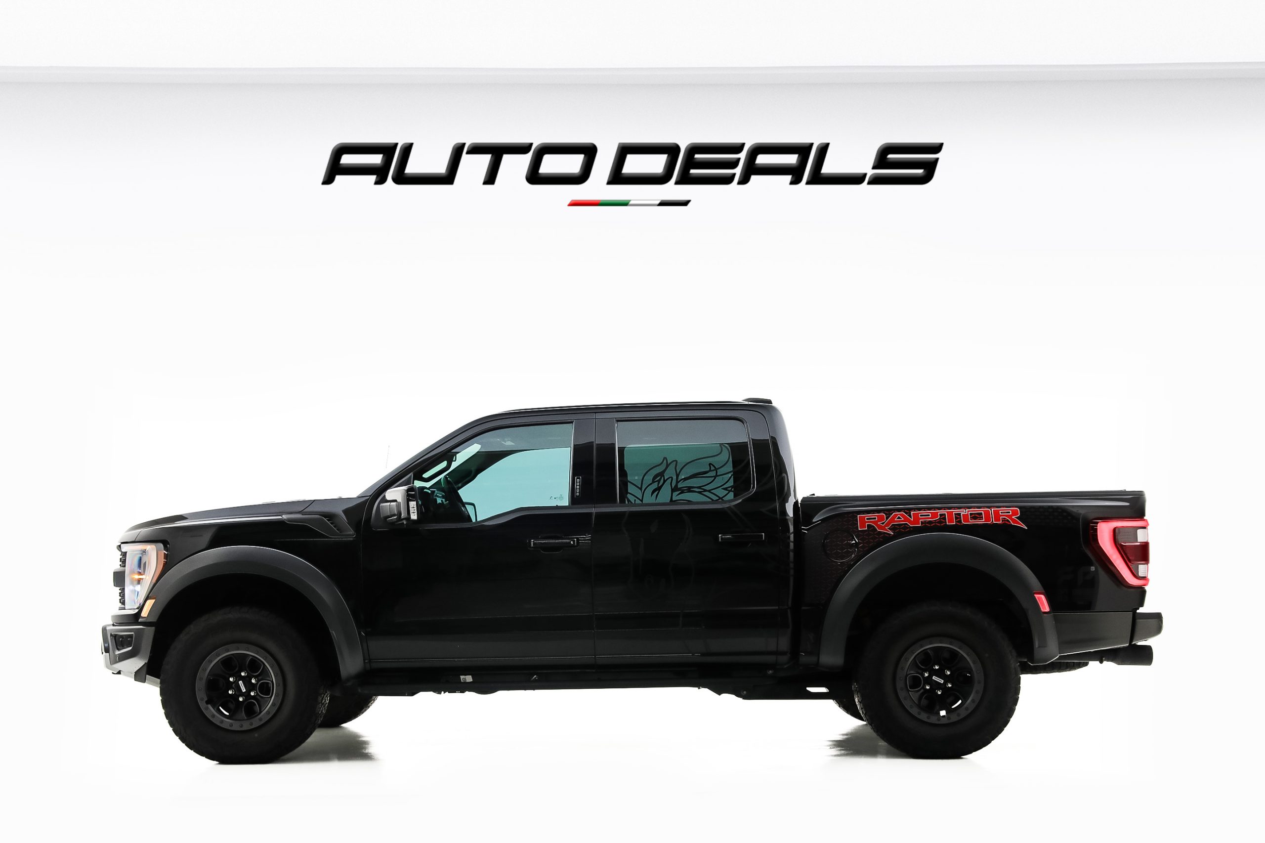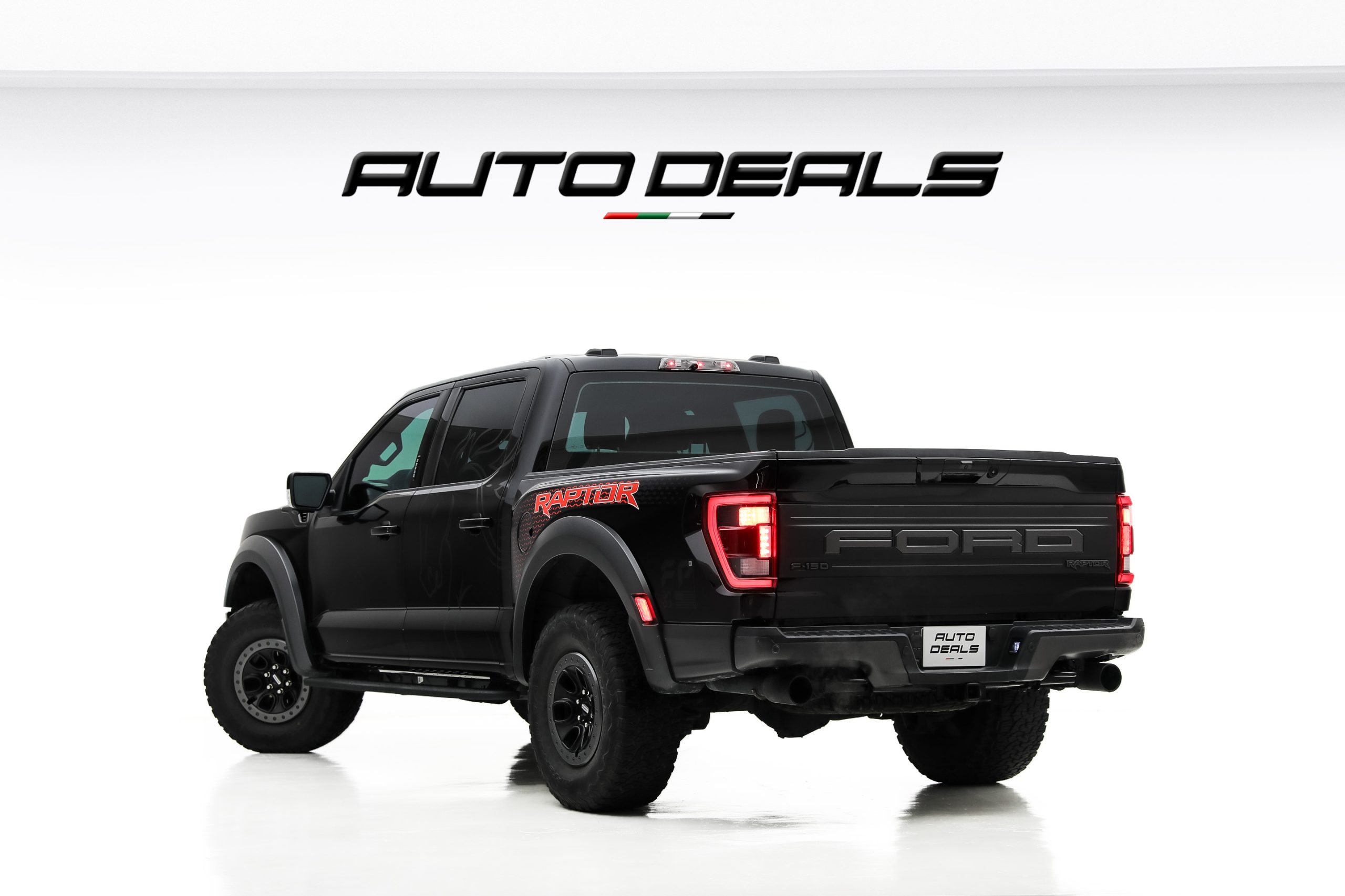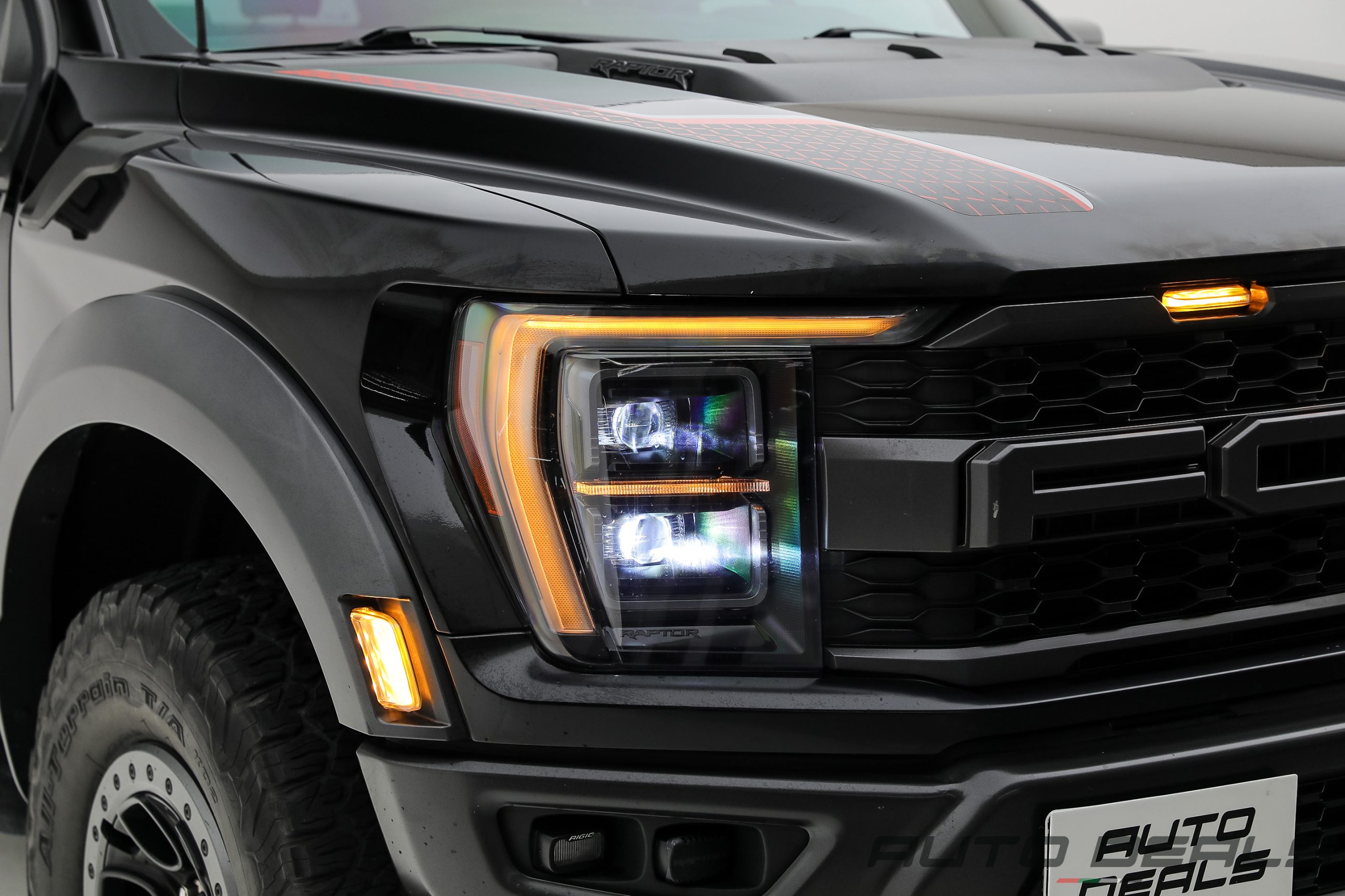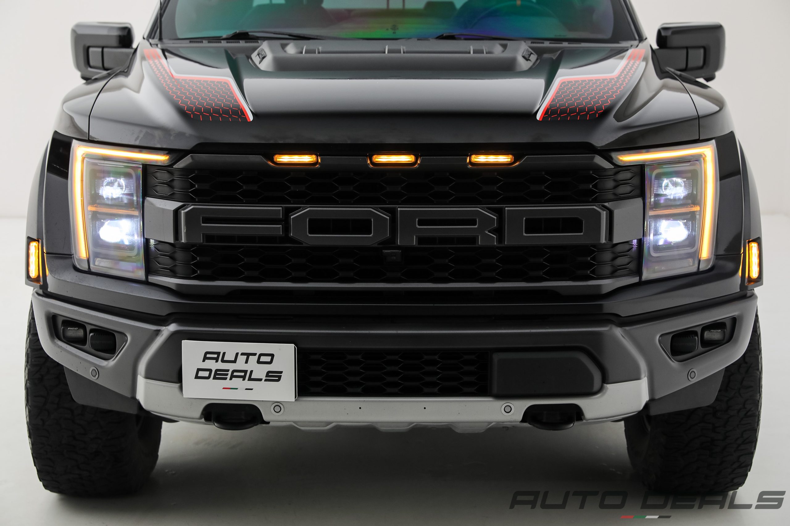 The Ford F-150 Raptor features a bold and aggressive design that clearly reflects its off-road capabilities. A massive front grille with large FORD lettering dominates the front fascia, giving the truck a powerful and unmistakable presence.